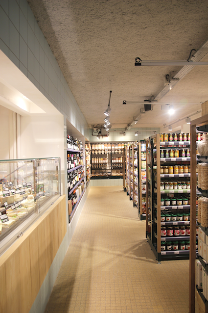 L’intérieur offre des points identifiables et associés à l’imaginaire collectif des enseignes de quartier : une boulangerie, une boucherie, un primeur... Cet effet est accentué par l’utilisation de matériaux traditionnellement dédiés au commerce : carrelage et bois.